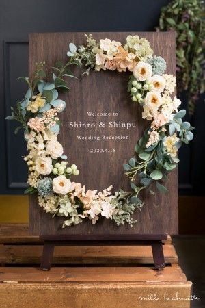 お二人の名前を言葉にアレンジした『名詩』を、フラワーアレンジが引き立ててくれます。 色鮮やかなウェルカムボードはゲストの目を惹き、足が止まることでしょう。 美しいポエミーな言葉と雰囲気が、二人の温かい愛を感じさせてくれます! スワロフスキーの輝きも見逃せない逸品です。