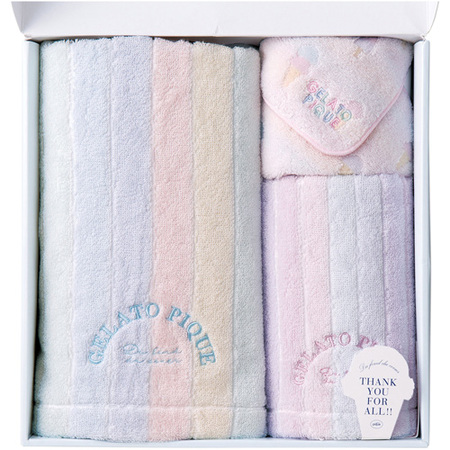 タオルハンカチ・フェイスタオル・バスタオル×各1枚セット。 「ジェラートピケ」特有の全体的に淡い色合いと、ふわふわタオルが魅力。タオルハンカチのアイスクリームデザインがとてもかわいらしいタオルセットです。綿100% 日本製。 結婚祝いに、スイーツ好きな奥様にいかがでしょうか?色合いがキュートなので使うのが楽しくなりそう♪