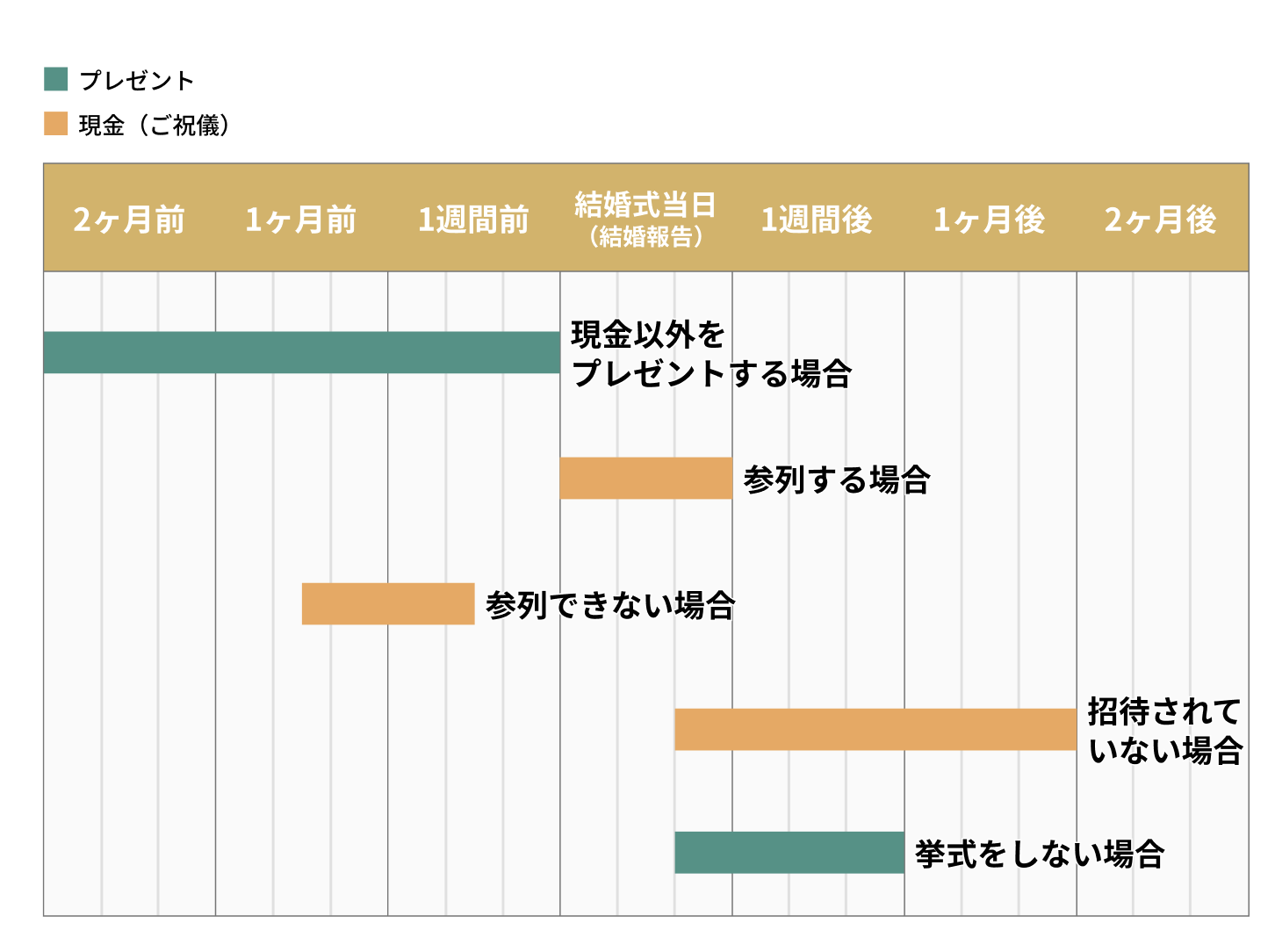 結婚祝いとしてギフトを贈る時期は、結婚の報告を受けてから1カ月以内に贈れるとよいでしょう。 結婚式に招待され、ご祝儀とは別にギフトを贈りたい場合は、結婚式の1~2カ月前に贈るのがベストです。式当日は新郎新婦が忙しいため、直接ギフトを渡すのは避けましょう。 ギフトを贈るのが式までに間に合わなかった場合は、結婚式後1カ月以内に渡すようにしましょう。 また、お相手が挙式をしなかったり、結婚の日取りが決まっていなかったりすることもありますよね。 その場合は、お相手から結婚の報告を受けた後なるべく早く、遅くとも1カ月以内には渡すようにしましょう。入籍の予定が分かっている場合は、その1週間前までに渡すのが理想的です。