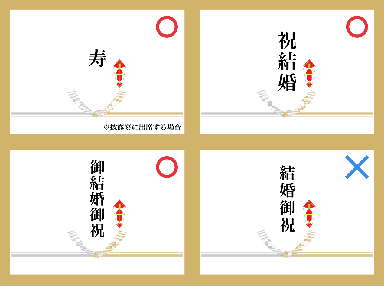 「のし紙」の中央上部には、「表書き」と呼ばれる、贈り物の名目を書きます。 結婚祝いでの名目は「寿」「祝結婚」「御結婚御祝」の3つが一般的です。 4文字は縁起が悪いとされているので、避けるようにしましょう。 「のし紙」をかける際は上記のことを注意してくださいね。