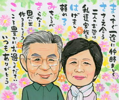 ポップでかわいい!と評判の色紙サイズの似顔絵。 還暦を迎えたご夫婦へのプレゼントに人気です。 やわらかなタッチで、かわいく描いていただけます。 納期は、約2週間です。