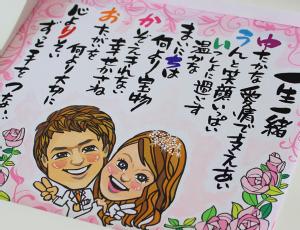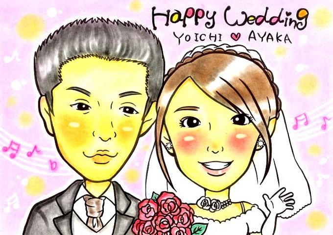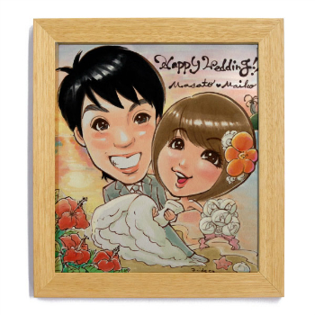 ほんわか、柔らかなタッチで新郎新婦を素敵に描いてくれます。 名前ポエム入りで、一生の記念になりそう。 定番の色紙サイズなら、10000円です。 製作開始から約2週間で納品です。 結婚祝いのプレゼントにおすすめ。