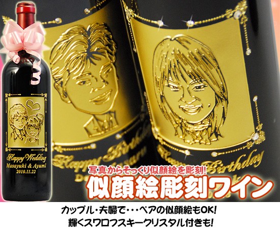 ワイン好きな方への結婚祝いに喜ばれている、似顔絵入りのワインボトル。 似顔絵だけでなく、名前や記念日なども彫刻できます。 注文翌日から8〜12日でお届けです。 税込価格10,368円です。