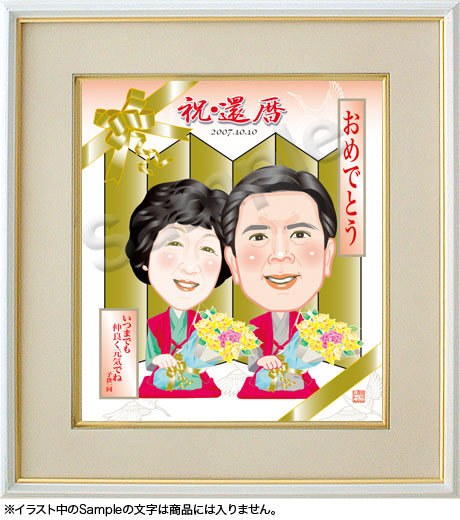 額入りで、そのまま飾れる!と人気の似顔絵です。 美しく、カワイイ似顔絵で、絶対に喜んでいただけます。 納品までは1〜2週間です。 還暦を迎えたご夫婦へのプレゼントにいかがでしょうか。