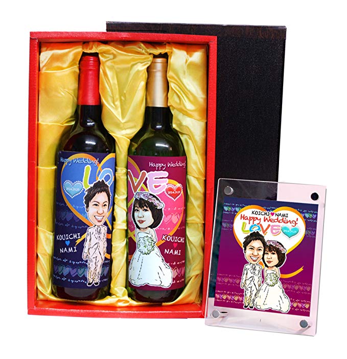 2本のワインにそれぞれ似顔絵が描かれます。 ワインの組み合わせは、赤と白でそれぞれ選べます。 フォトフレームに入った似顔絵もセットで、結婚祝いにおすすめです! 通常、注文から1〜3週間ほどでお届けです。 価格17,280円です。