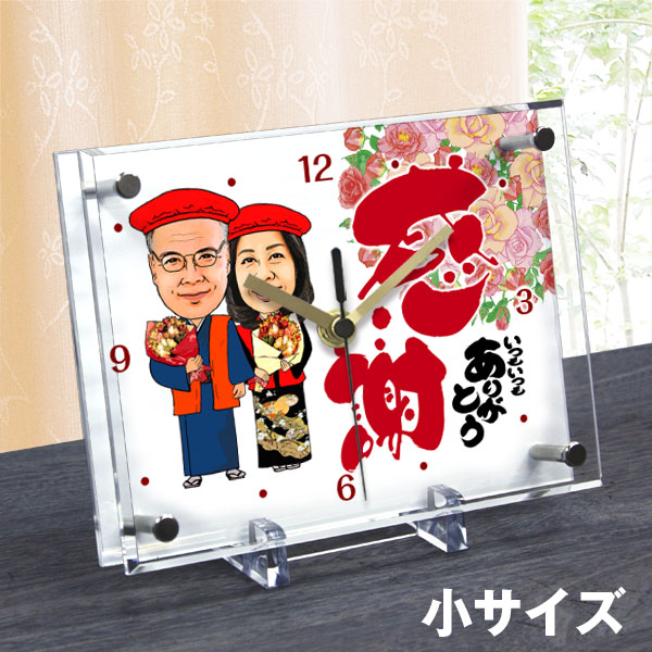 似顔絵と、メッセージをデザインしてくれる置き時計は、還暦を迎える方へのプレゼントに人気です! デザインは30種類からお選びいただけます。 また、人物の衣装もたくさんある中からお選びいただけます! 写真がお店に届いてから10営業日以内に完成画像がメールで届き、確認してOKの返事を確認してから3営業日以内に発送されます。 税込14,580円です。