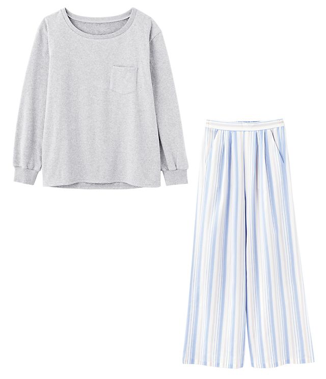 上下異素材のコーデパジャマです。無地とストライプ柄がすっきりとお洒落なコーデ。パンツはワイドシルエットで脚をカバーし、スタイルをよくみせてくれます。 眠っている時も、起きている時も着心地よく、ラフなスタイルで一日中ゆったり過ごせます。 メンズとペアで結婚祝いに、お洒落なパジャマを贈りましょう!