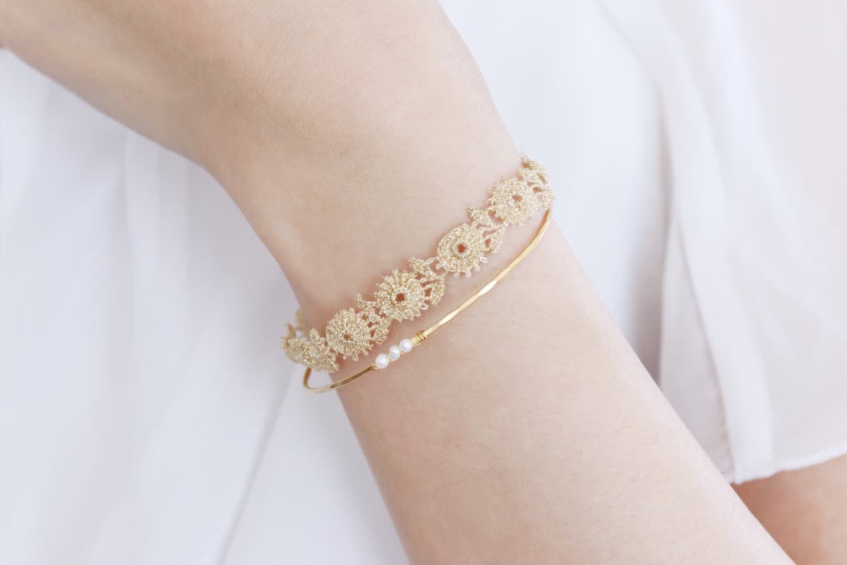 彼女の腕をほっそり上品に見せてくれるブレスレットはいかがですか? お花とレースのデザインはどんな女性へ贈っても喜ばれるはずです! 1本使いや2本使いなど使い分けることで、着こなしの幅も広がります。