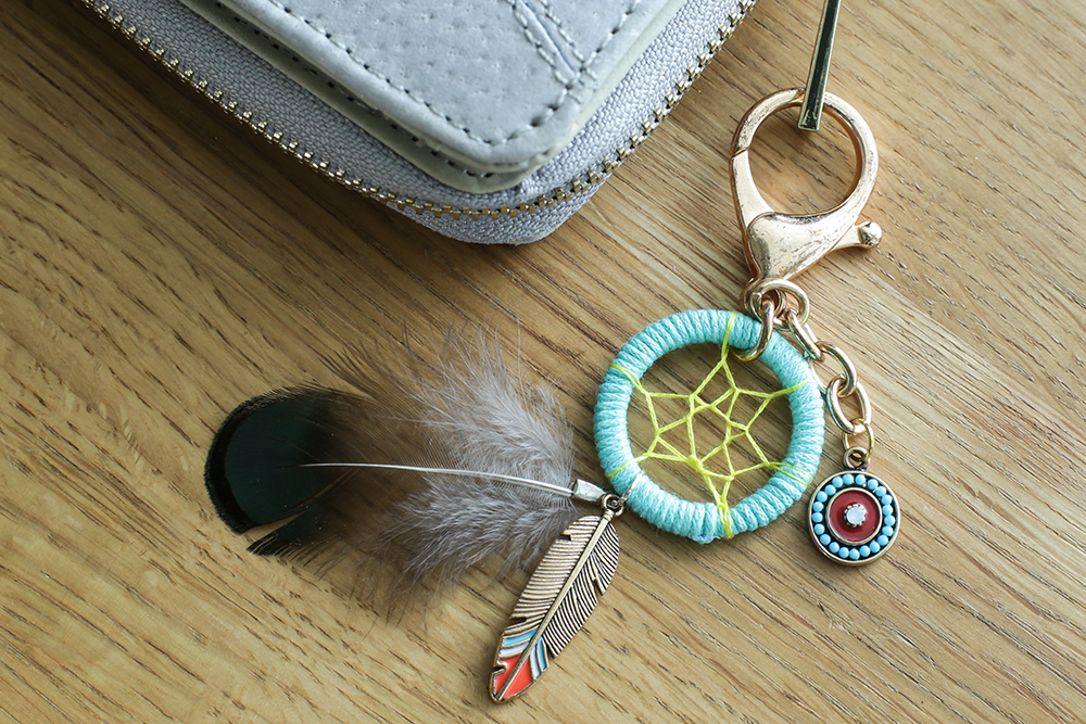 【材料】 ・キーホルダー金具(ゴールド)…1個 ・ワックスコットンコード 07 φ1mm×6m(ターコイズ)…1個 ・刺繍糸 1m×12色…1個 ・ナチュラルフェザーチャーム 02 キジ&ホロホロ鳥(キジ)…1個 ・アクセサリーチャーム 22 メタルフェザー(金色)…1個 ・アクセサリーチャーム 25 ターコイズ(ターコイズ・コーラル風)…1個 ・アクセサリーパーツ 02 丸カン φ6mm(金色)…1個 【作り方】 ①キーホルダー金具の輪部分にワックスコットンコードを巻き付けます。 ②隙間がないように一周巻き終えたら、目立たないように糸端をボンドで接着します ③刺繍糸の中から黄色を1本引き抜き、それを2本取りにして使用します。 ④輪に刺繍糸をかけていきます。 ⑤各パーツを取り付けて完成