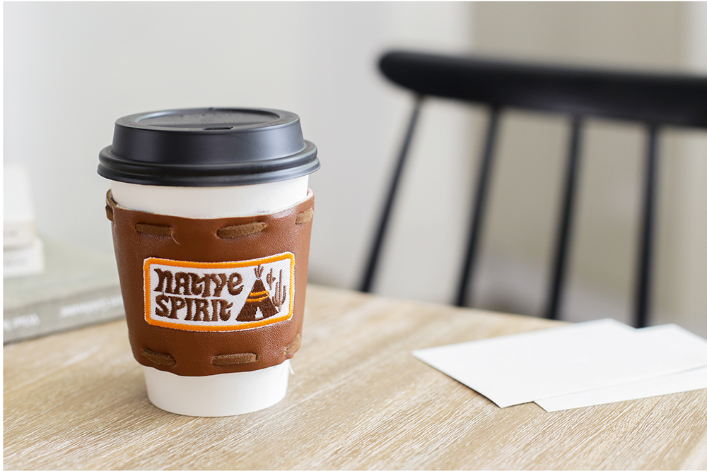 【材料】 ・フェイクレザーコード ダーク 110cm(ブラウン)…1本 ・フェイクレザー布 30cm×20cm(ブラウン)…1枚 ・アップリケ アメカジタイプ B(NATIVE)…1枚 ・綿麻ナチュラルチェックカットクロス 35×30cm…1枚 ・両面接着芯地 40cm×50cm…1枚 ・粘着ワンタッチシート 幅広タイプ 10×10cm…1枚 【作り方】 ①フェイクレザー布の中央にアイロンでアップリケを貼り付けます ②粘着ワンタッチシートを本体の表裏にそれぞれ貼り付け、シートの端を縫い留めます。 ③フェイクレザー布とカットクロスを接着芯地で貼り付けます。 ④目打ちで穴をあけながら、フェイクレザーコードを通し、最後は結んで完成
