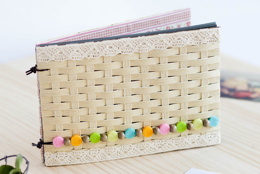 【材料】 ・クラフトペーパーバンド クリーム5m…1巻 ・フェルトモチーフ ドットパステル小…1袋 ・B6アルバム15枚 スクラップブッキングタイプ…1冊 ・パッチワークカットクロスD…1枚 ・ウッドビーズ ラウンドM…1袋 ・コットンレーステープ…1個 ・クラフトペーパー2S クラフト…1個 ・丸革ヒモ ブラウン…1個 【作り方】 ①クラフトペーパーバンドをカットします。 ②表紙にクラフトペーパーとカットクロスを貼ります。 ③表紙にペーパーバンドを貼ります。 ④飾りパーツを作り、取り付けて完成