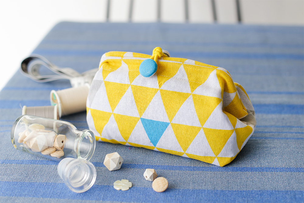 【材料】 ・手ぬぐい風タオル 三角柄 縦33cm×横90cm(イエロー)…1枚(表布) ・シャンブレーフリークロス 縦88×横45cm(ブルー)…1枚(内布) ※お好みの手ぬぐい風タオル、フリークロスをご使用ください。 ・ワイヤー口金 15cm…2個 ・くるみボタンキット18mm 7組…1個 ・リングゴム中 約17cm 4P カラー(黄系)…1個 ・超強力マグネットミニ8P…1個 【作り方】 ①手ぬぐい風タオル(表布)、フリークロス(内布)を適当な大きさにカットします。 ②表布を27×19のサイズに2つ折りにし、両脇を縫います(縫いしろ:1cm) ③縫いしろが中心になるように、底を三角に折ります。 ④縫いしろをアイロンで割り、マチを縫い、三角部分を下に折ります。 ⑤表布と同様に内布も縫います。 ⑥表布と内布を重ね合わせます。 ⑦表布を1cm折ります。 ⑧更に2.5cmほど折り、内布と一緒に縫います(縫いしろ:5mm) ⑨表に返します。 ⑩ワイヤー口の角にマグネットを1つ接着剤で取り付けます。同様にもう一つ作ります。 ⑪あき口からワイヤー口金を通します。同様にもう片方も通します。 ⑫あき口を縫い閉じます。 ⑬カラーゴムの中心を結びます。 ⑭ボタンキットでくるみボタンを2つ作り、両面に縫い付けます。 ⑮ボタンにカラーゴムをかけて口をとめて完成