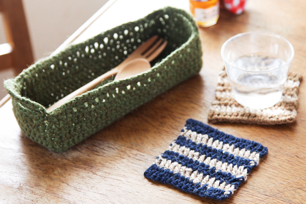 【材料】 <カトラリーケース> ZAKKAジュートcol.4…2玉 <コースター> ・ZAKKAジュートcol.1、2、3…各1玉 ・かぎ針8号…1本 ・とじ針セット…1本 【作り方】 ①模様編みや細編みを使い分けてカトラリーケースを編みます ②コースターを編んで、完成