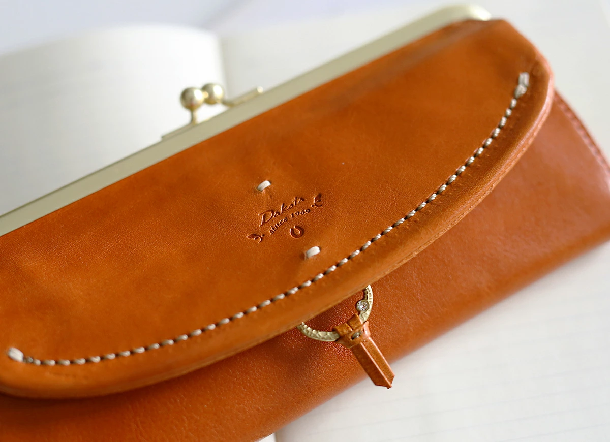外から見ると、革を感じられるプレーンでシンプルな長財布。開けると収納部に仕切り兼カードポケットを設けたユニークな構造になっています。