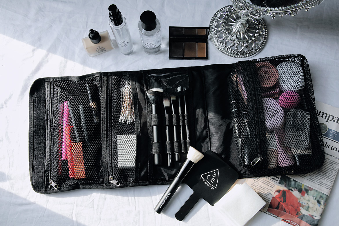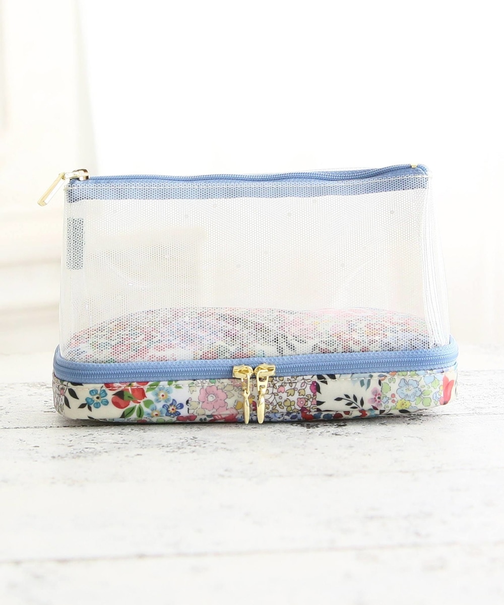 生活防水がほどこされた便利なポーチ! しかも中身はメッシュ素材のため使いたいコスメが発見しやすく、ブラシ収納も抜群! 旅行先にもコレ1つでコスメを収納したまま持ち運びできます。