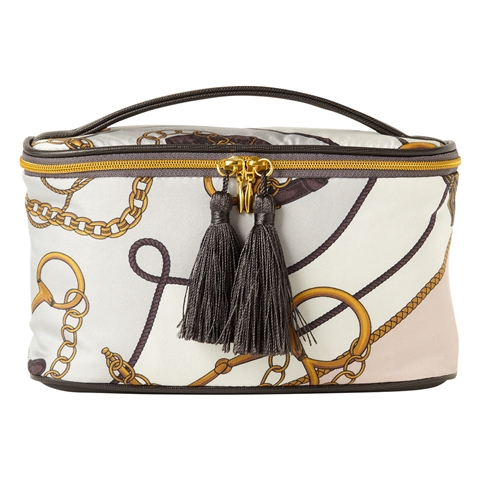 オリジナルのシルクスカーフの模様が大人っぽいポーチです。 収納力抜群で、中にはブラシケースも内蔵されてお化粧道具入れにぴったり! 大人な女性やお化粧道具が多い人への誕生日プレゼントにおすすめ。