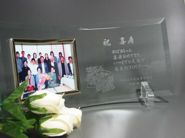 名前やメッセージなどが入れられる、ガラス製のフォトフレームです。 お祝いの気持ちや感謝の気持ちをガラスに刻印でき、還暦祝いはもちろん喜寿や古希などのお祝いに贈っても喜ばれます。 いつまでも色あせないガラスアートがとっても素敵ですよね♡