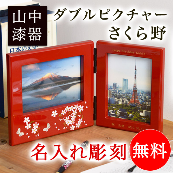華やかながらも落ち着きがある、とても美しい柄のダブルピクチャーさくら野です。 折り畳み式となっていて、写真を2枚飾ることができます。 繊細で優美な山中漆器の蒔絵は、還暦祝いはもちろん、海外の方への贈ってもとても喜ばれる一品なんですよ♡