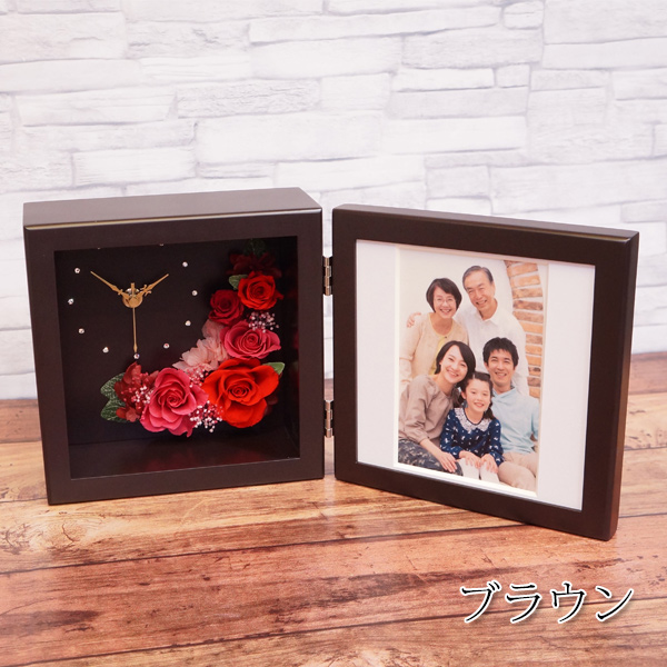 還暦祝いらしい赤いバラのプリザーブドフラワーをあしらった、時計付きフォトフレームです。 このフォトフレームは「これからも家族と一緒に楽しい時間を過ごそうね」という想いを込めたデザインとなっていて、お祝い事に最適です。 飾る写真は縦でも横でもOK、さらにL版サイズでもポストカードサイズでも大丈夫なので、選べる写真の幅が広がりますよね♪