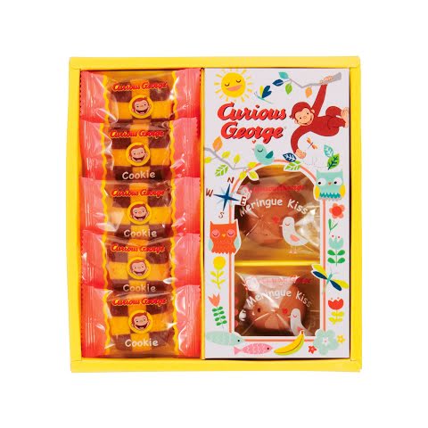 連名でお祝いをいただいた場合、一人一人の内祝いの予算が低額になってしまうことがありますよね。 そんな低予算の時でもしっかりしたものが贈れるのがスイーツギフトのいいところです! こちらは1000円以内で贈れるおさるのジョージのクッキーセットです。 バナナ柄のクッキーやメレンゲキッスなどがセットになっています。
