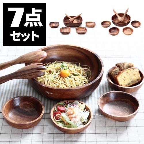 木製の食器の7点セットです。 サラダボウルにとり皿がセットになっているので、家族で使っても来客時に使ってもいいですよね♪ 飽きのこないシンプルさが、とても人気の一品です。