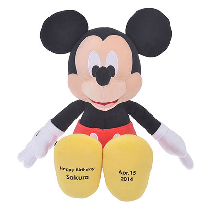 新しいデザインのミッキーぬいぐるみ。右足にメッセージ(定型)と名前、左足に生年月日など入れられます。ミニーとセットでそれぞれの名前を入れてプレゼントするのも素敵ですね! ミッキー好きな方へ、クリスマスプレゼントにオススメです!