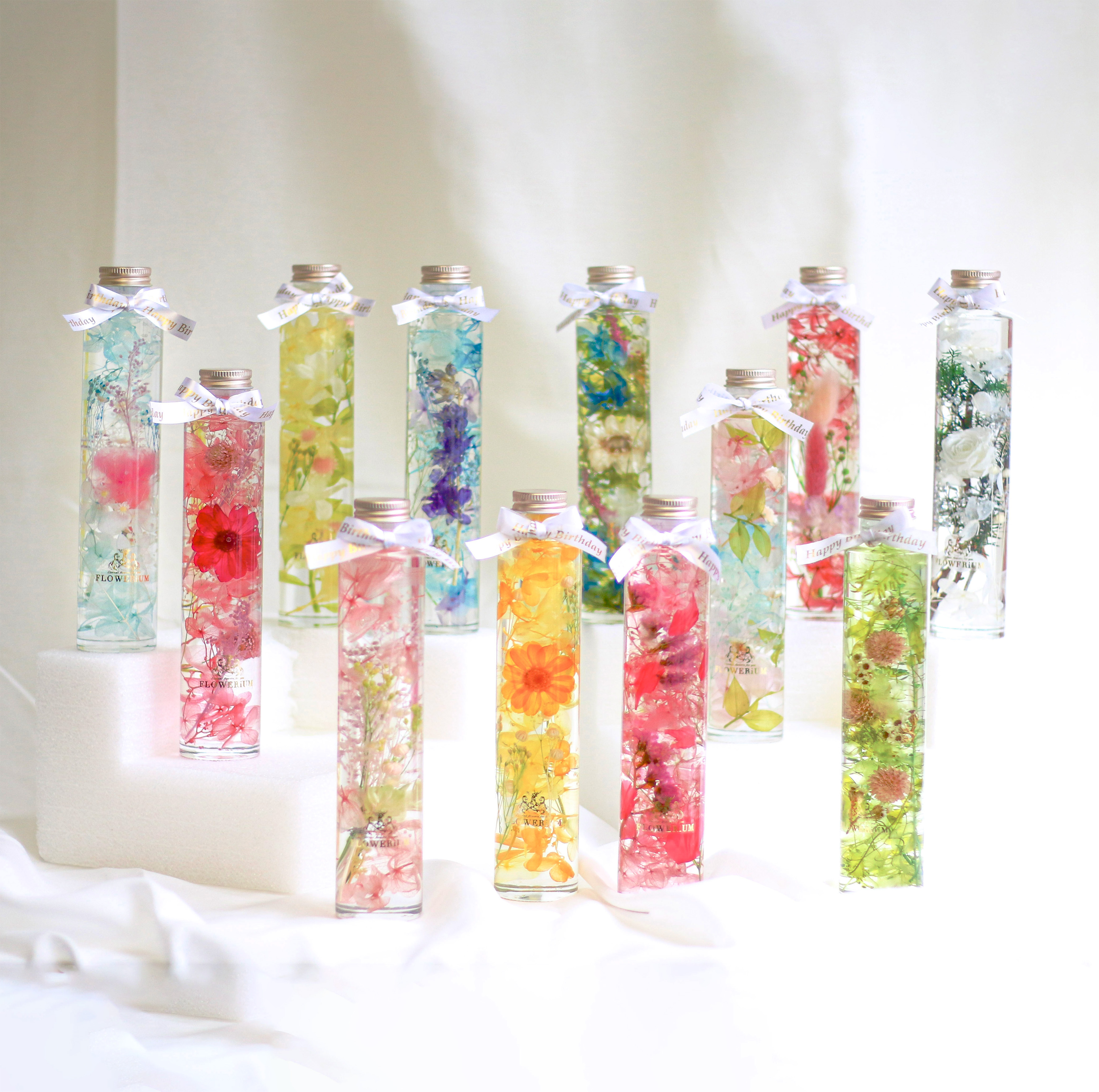 12ヶ月の誕生花をメインにアレンジされた花たちと、"Happy Birthday”のメッセージが入ったゴールドリボンがキュートな誕生日ギフトにぴったりのタンプ限定FLOWERiUM®です。