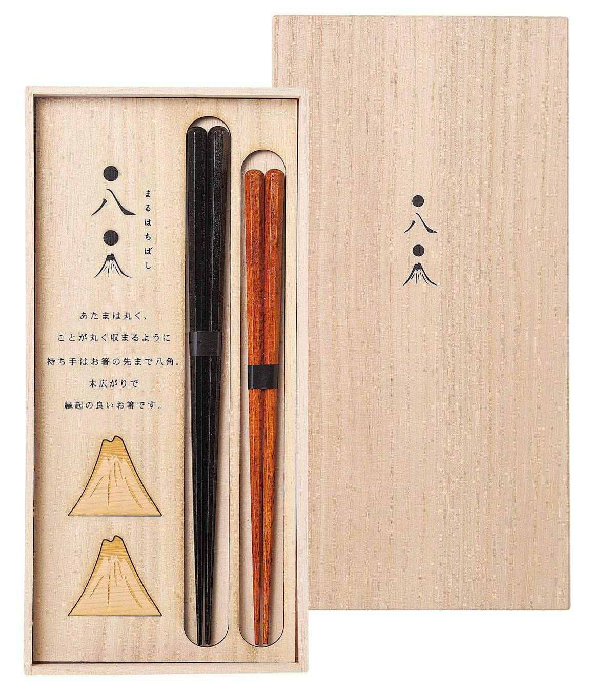 末広がりの八角形の箸を「事が丸く収まる」という意味も込め持ち手上部を丸くしたデザインの箸はタモ材を使用しています。 バッドなどに使われる木材は折れにくく丈夫です。 箸置きは富士山がモチーフで縁起が良く、シンプルで飽きのこないデザインはずっと使える箸として人気です。