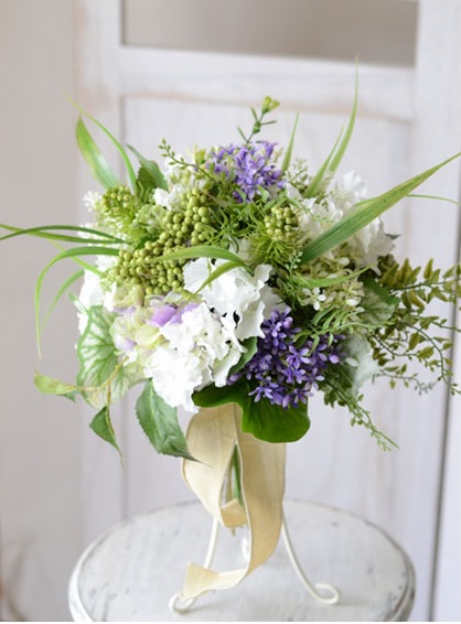ナチュラルな雰囲気のグリーンベースのアートフラワーのブーケ。 クラッチブーケでカジュアルな結婚式にも とてもぴったりなデザインです。 お部屋のインテリアとしても素敵なブーケです。
