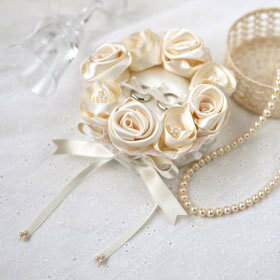 サテン生地のローズがリングを囲む、品のあるデザイン。 豪華で存在感もありますので、喜ばれる結婚祝いプレゼントになることでしょう。 ローズも1つ1つ手作りすることができます。 作り手によって味わいが変わりますので、世界に一つのハンドメイド作品を贈ることができますよ。
