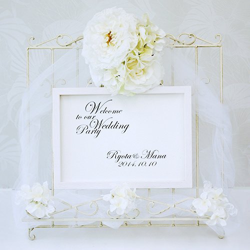 デコラティブな模様のアイアンイーゼルを使ったウェルカムボードのセットです。 フレームにはデザインされた「welcome to our wedding party」の文字が入った用紙と無地の用紙がセットになっていますので、テンプレートをダウンロードしてお好きな文字を印刷したり、写真を入れたりしてお使いいただけます! 花や額の位置を変えたり、チュールの巻き方を変えるだけで印象が変わるので、ご自身なりのオリジナルウェルカムボードを作ってみましょう◎