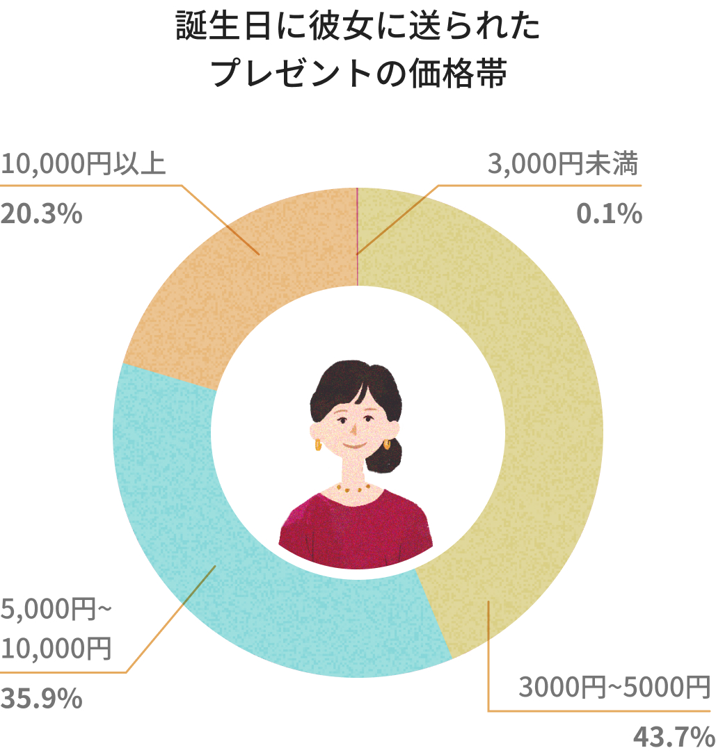 彼女への誕生日全体で見ると、上のグラフのように、【3,000円〜5,000円】が最も多いです。 しかし、年代別で平均予算を見てみると、経済的な事情からかなり異なってきますので、次で詳しく解説していきます!