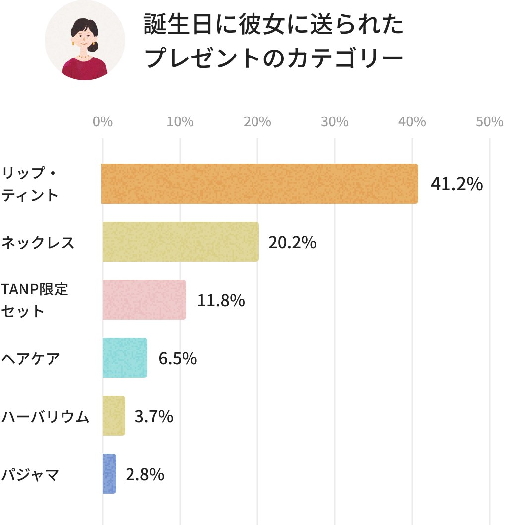 彼女への誕生日プレゼントとして最も人気なのが【リップ・ティント】です。 コスメは相手の雰囲気や好みに合わせて選ぶことができるので、彼女に喜んでもらえます。 また、誕生日ということでネックレスやタンプオリジナルの限定セットのような、サプライズ感のあるプレゼントもおすすめです。 今年はタンプで誕生日プレゼントを贈ってみませんか?