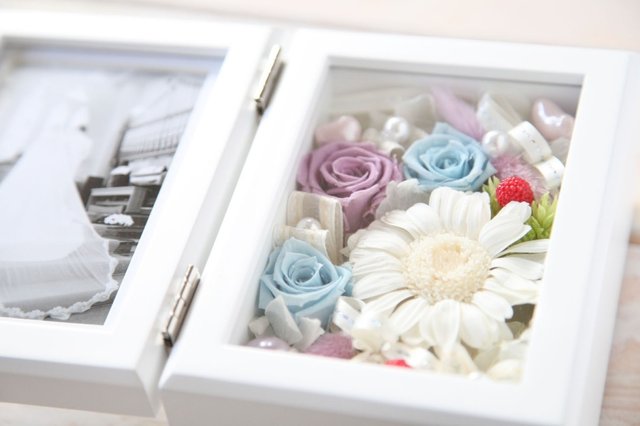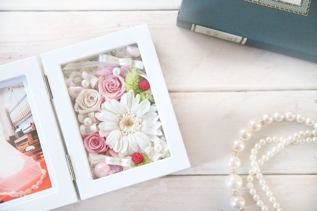 ジュエリーボックスになっており、フォトフレーム×プリザーブドフラワーも施されたギフトです。 指輪やネックレスを収納することができてとても便利です◎ 結婚指輪を仕事柄付けれないなんて方は、写真と共に保管しておくのにもおすすめ。