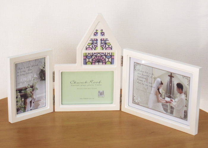 ブルーの爽やかなステンドグラスが印象的な、白い教会をイメージしたフォトフレームです。 結婚式のシーンをそのまま写真立てに飾れます。 上品なパールカラーの木製フレームがより一層、結婚式の写真に華やかさをプラスします◎ ぜひ、友人の結婚祝いで贈ってみませんか?