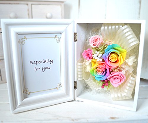 女性なら誰もが憧れるレインボーローズが魅力的なフォトフレームです。 ほんのりとお花の香りも楽しめるので、写真を入れて視覚的にも堪能してもらいましょう◎