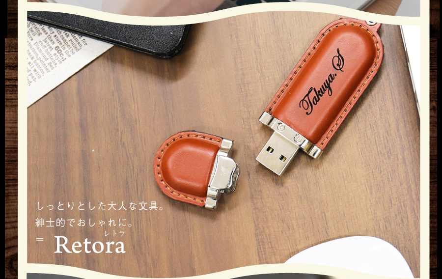 レザーの光沢感がオシャレなUSBメモリです。 仕事には欠かすことのできないUSBだからこそ、オシャレに持ち歩けたら素敵ですよね。 ブラックとブラウンから選ぶことができ、刻印文字も漢字・ひらがな・アルファベットと各書体を選ぶことが可能です。オシャレに名入れをして、30代男性に素敵な送別会プレゼントを贈りましょう。