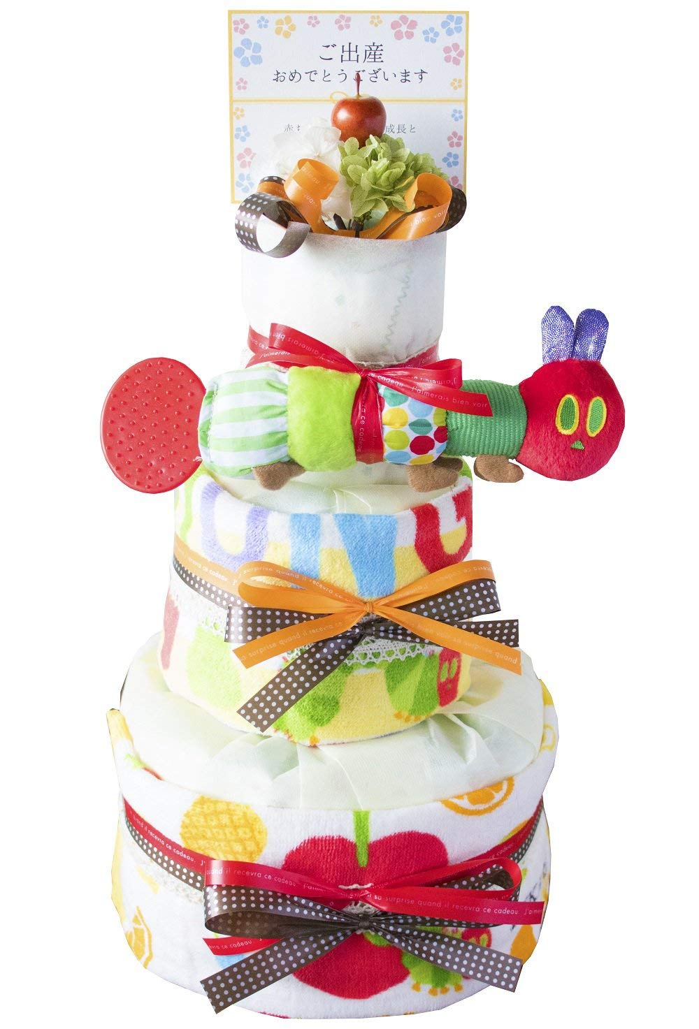 続いてご紹介するのは、「はらぺこあおむしネームタオル付き おむつケーキ」です。 パンパースのオムツ24枚のほか、はらぺこあおむしのタオル2枚とおもちゃ、プリザーブドフラワーが、色鮮やかでかわいらしいケーキの形にデコレーションされています。 ついつい飾っておきたくなるかわいさですが、実用性もばっちり。オムツもタオルもいくつあっても困らないので、三人目のママにも重宝されるはずです。