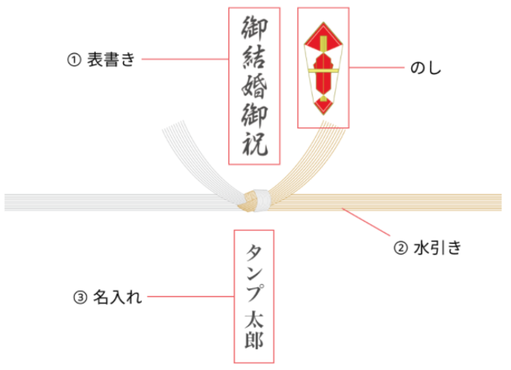 まず、熨斗(のし)について説明します。のしはおもに4つの要素から構成されています。 熨斗(のし)は、日本に古くから伝わる、贈り物に添える飾りのことです。 フォーマルな場面での贈答品や目上の方への贈り物には、熨斗(のし)をつけるのが一般的です。 ・熨斗(のし) のし紙の右上にある、六角形の飾りのことです。 もとはあわびを薄くのしたもので、神仏に生ものをお供えする風習に由来しています。 ①表書き(名目) のし紙の上段中央にある、贈り物の目的についての記載のことです。何を記載するかは、シーンによって使い分けが必要です。 別名を「名目」といい、のし紙の表側全体を「表書き」という場合もあります。 ②水引 のし紙の中央の、ひも飾りの印刷を指します。水引はシーンによって、結び方や色などに決まりがあります。本来は包み紙が開かないように結ぶひもであり、簡易版であるのし紙にはそれが印刷されています。 ③名前書き(名入れ) のし紙の下段にある、送り主の署名のことを指します。人数や贈り主によって、書き方にルールがあります。