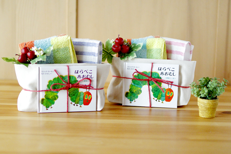 小さなはらぺこあおむしの絵本とビタミンカラーが鮮やかなあおむしハンドタオル。 高品質の今治ハンドタオルをシンプルなトートバックにまとめました。 可愛らしいセットは、プレゼントに大人気! 出産祝いのプレゼントにいかがでしょうか。