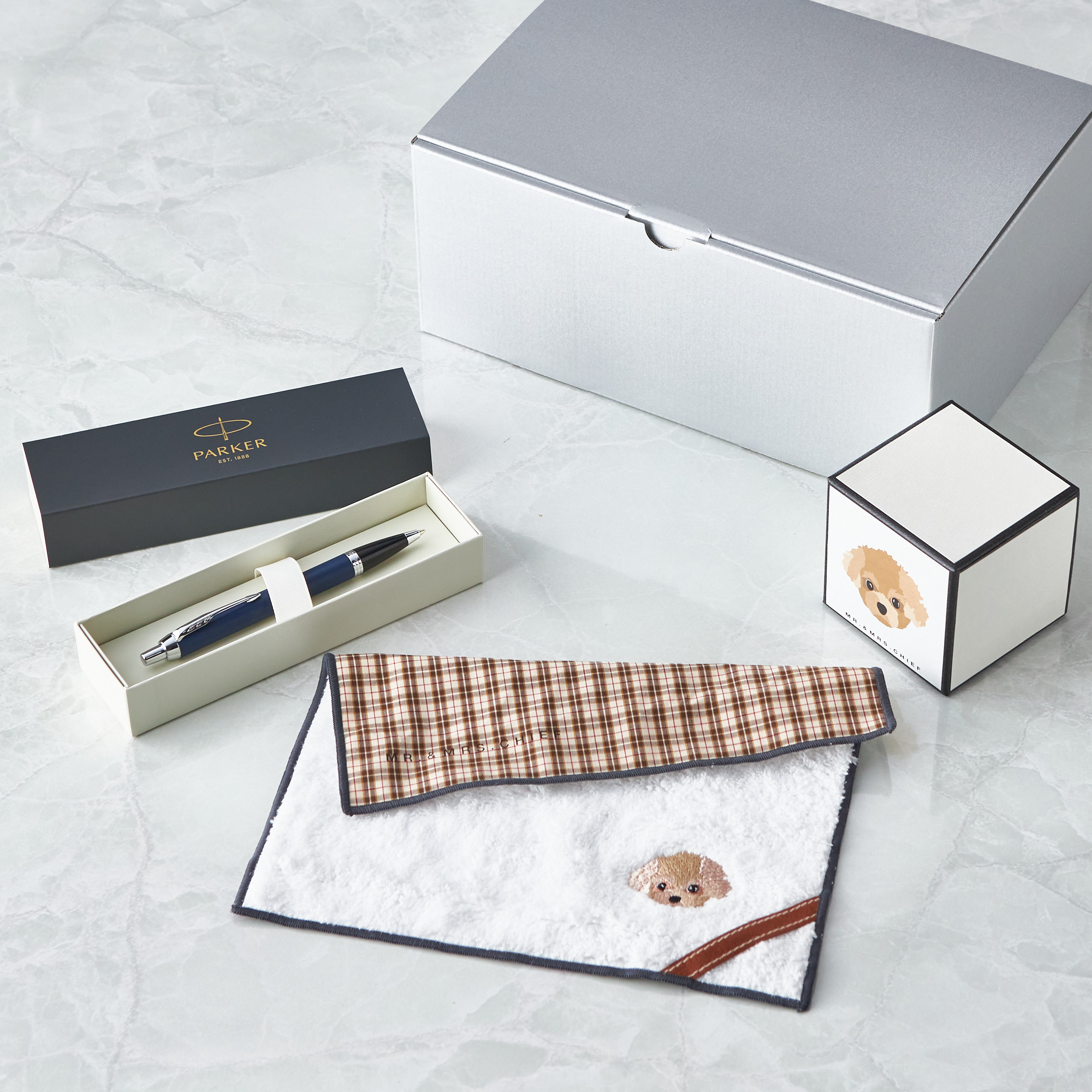 【名入れ/ギフトBOX】ボールペン&タオルハンカチ(イヌ)セット【タンプ限定】