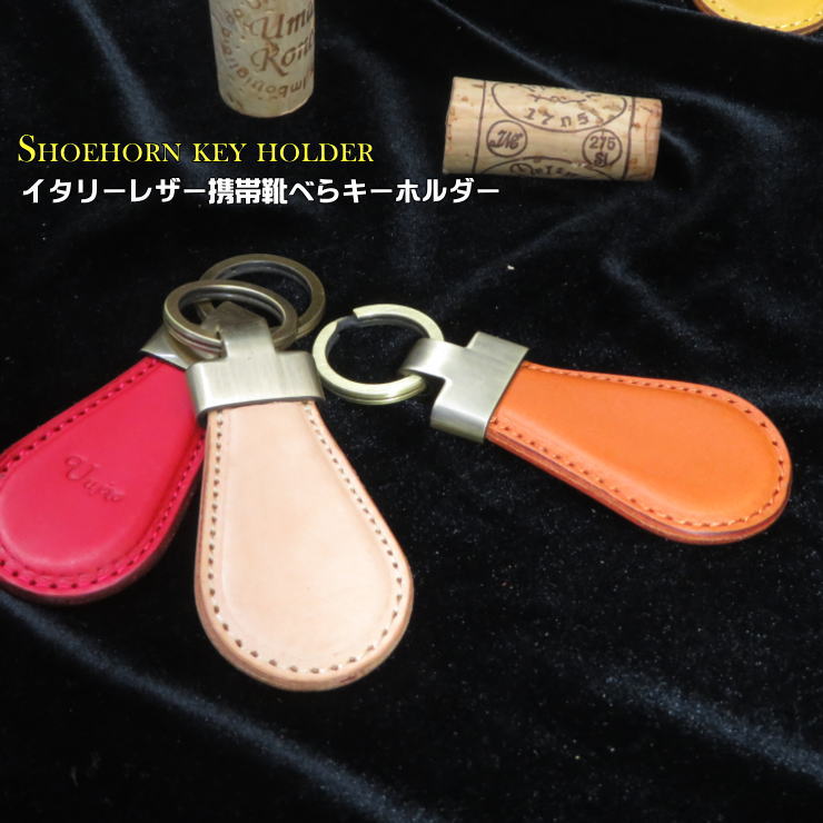 イタリアンレザーを使用したシューホーンのキーホルダー。 バッグや鍵に取り付けられるので、バッグ内で靴べらが迷子になってしまうことも防げます。 革の程よい柔らかさとゆるく曲線を描いたフォルムが足の形にフィットし、スムーズに靴を履くことができます。