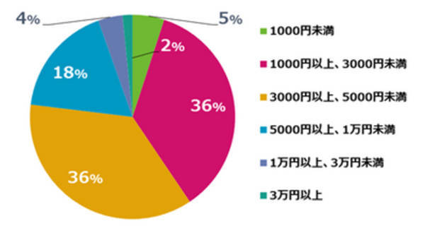 1000-3000円 36% 3000-5000円 36% 5000円-1万円 18% 上記のグラフの通り、1万円以下がほとんどであることがわかります。 年齢によっても費用の変化はありますが、贈る側が若年層の場合 4,500円~5,500円 中高年層の場合 5,000円~7,000円ほどになります。