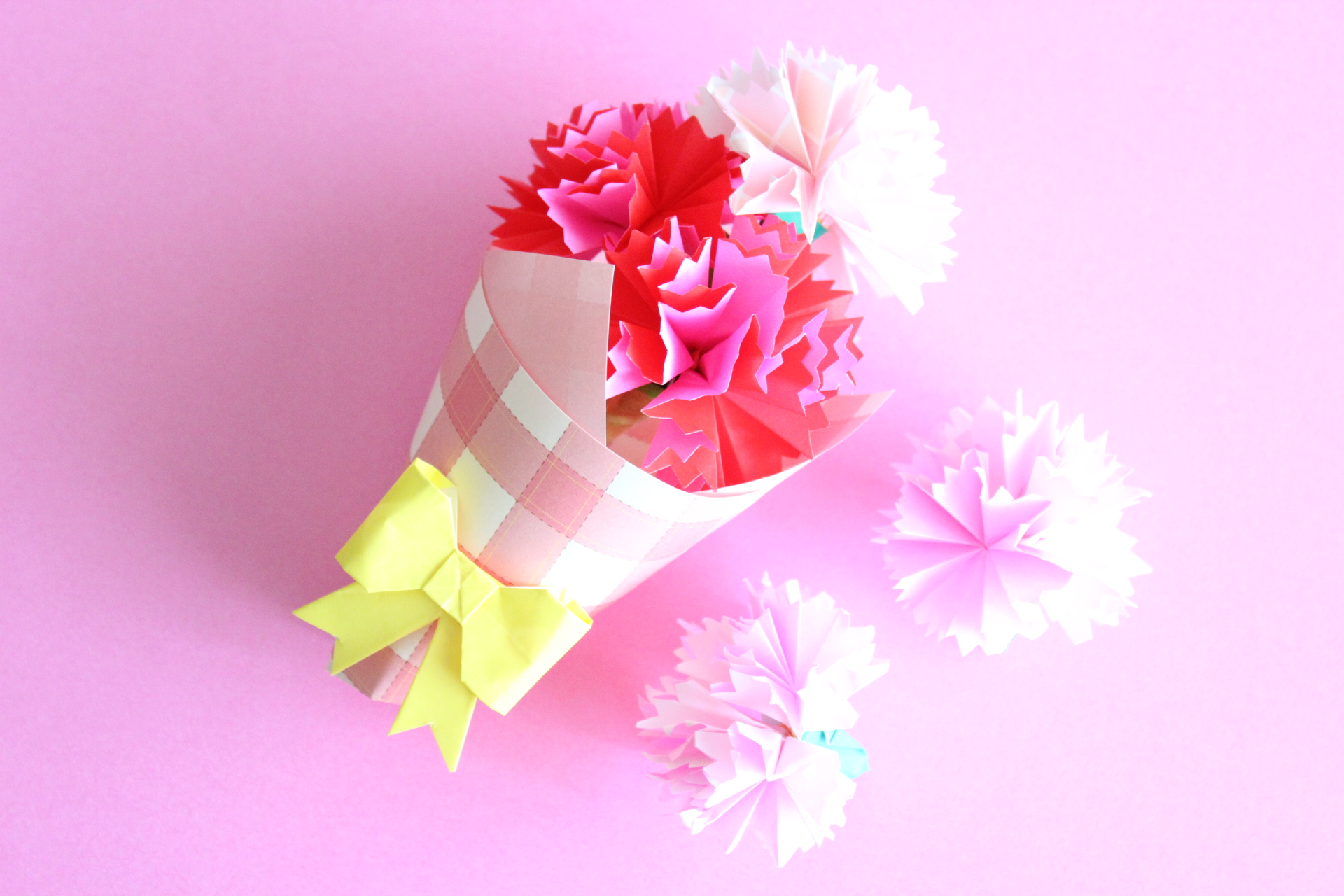 次にご紹介するのは、折り紙が得意ならぜひチャレンジしてほしい、ちょっと複雑な折り紙カーネーションです。お母さんに、どうやって折ったの?と聞かれること間違いなし!たくさん作って花束風にしたり、リース状にするのも可愛いですよ。