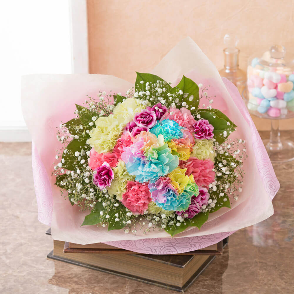 母の日に贈るカーネーションを、なかなか見ないカラフルなカーネーションを贈ってみてはいかがでしょう。 カラフルなカーネーションの花束は、とても素敵ですよね。 真ん中には、レインボーカラーのカーネーションも! レインボーカーネーションは、オランダではハッピーフラワーと言われているそう。 母の日に贈る花束としてもぴったりですね。