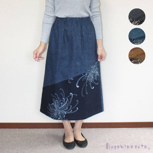 こちらのスカートはすそ広がりになっているため、 スタイルが良く見え、どんな服装にも合わせることができます。 また、和柄の切り替えが特徴的で、 他の人やお母さんが既に持っている服と被ってしまうことも少ないです。 50代のお母さんにはこちらのスカートをプレゼントしてみませんか?