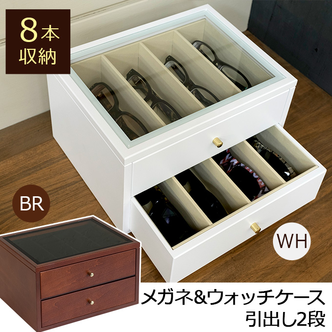 こちらは引き出し型のメガネケースです。 8本まで収納できます。 冗談はガラス張りなので、中身が見えるようになっています。 メガネだけでなく、時計をしまってもいいですね! カラーはホワイトとブラウンの2種類、どちらの色もお部屋に合わせやすくなっています。 引き出しの底面は傷つき防止のために、フェルトが貼ってあります。
