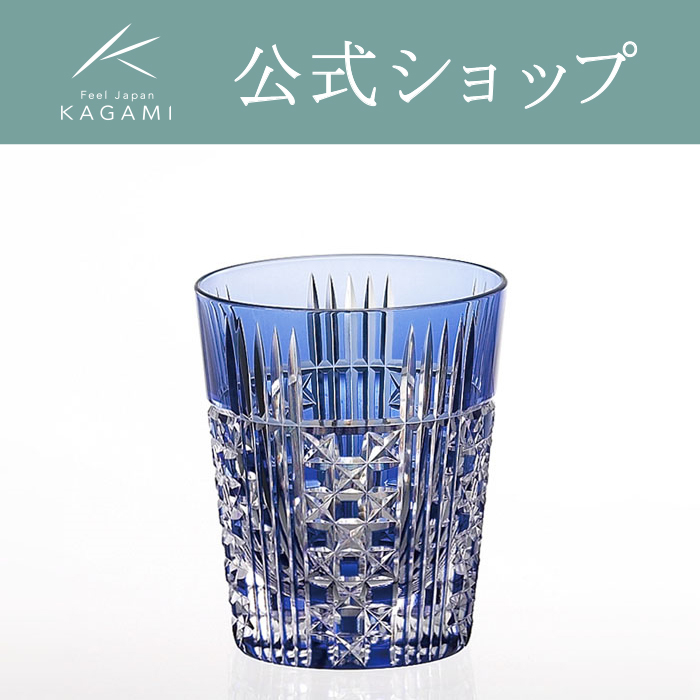 KAGAMI独自の色である「青墨色」のロックグラスです。 横から見るとシンプルなデザインですが、底面か見ると細かなカットが精密に施されています。 グラスを傾けると万華鏡のような世界が広がり、飲み物の色によって幾重にも表現が広がります。 日本の伝統芸能ならではの粋な計らいを楽しんでいただける一品です。