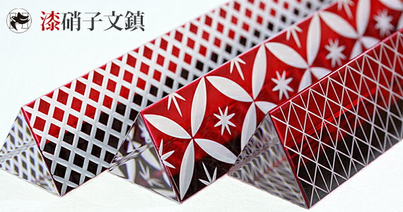 現代的な模様パターンが目を引くこちらは、「漆硝子文鎮」。 江戸切子と福島の会津塗りが出会って生まれた文鎮です。 漆塗り模様そのものの美しさはもちろん、硝子が光を受けて織りなす味わいも楽しむことができます。