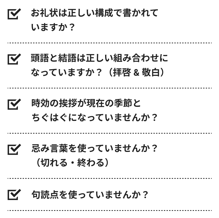 お祝い事のお手紙を書くときには、もうひとつルールが存在します。 それは「、」や「。」といった「句読点」を使わないということ。 句読点には「終わり」「区切り」という意味があり、幸せなことの終わりをイメージさせるため、お祝い事のメッセージでは避けるというルールがあります。 本来句読点を使うところでは、空白や改行を使うようにして読みやすい文章を書きましょう。